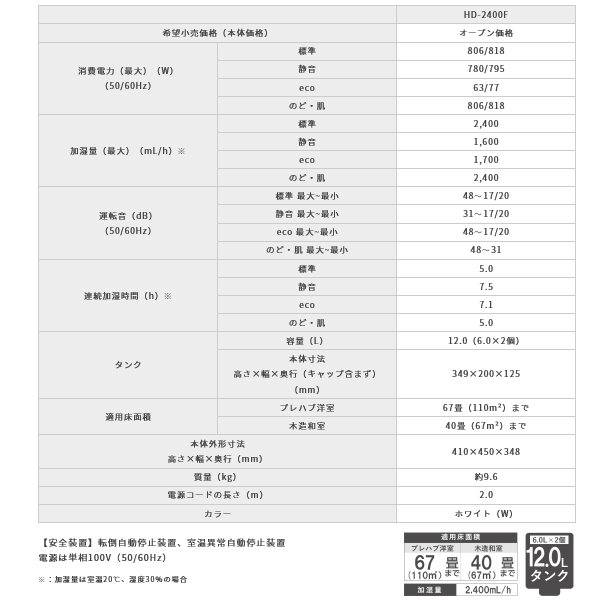 ■仕様・規格 加湿方式:気化ハイブリッド式 電源コード長さ:2m 加湿能力(L/h):2.4 加湿能力(ml/h):2400 タンク容量(L):12(6L×2) 消費電力(W)(50/60Hz):標準:806/818、eco:63/77 電源(V):単相100 標準消費電力料金:標準:約21.8円/h、eco:約1.7円/h 電源コード長さ(m):2.0 連続加湿時間(h):標準:5.0、eco:7.1 本体寸法(mm)幅:450 本体寸法(mm)奥行:348 本体寸法(mm)高さ:410 使用範囲目安木造:40畳 使用範囲目安プレハブ:洋室67畳 ■注意事項 水道水以外は使用しないで下さい。