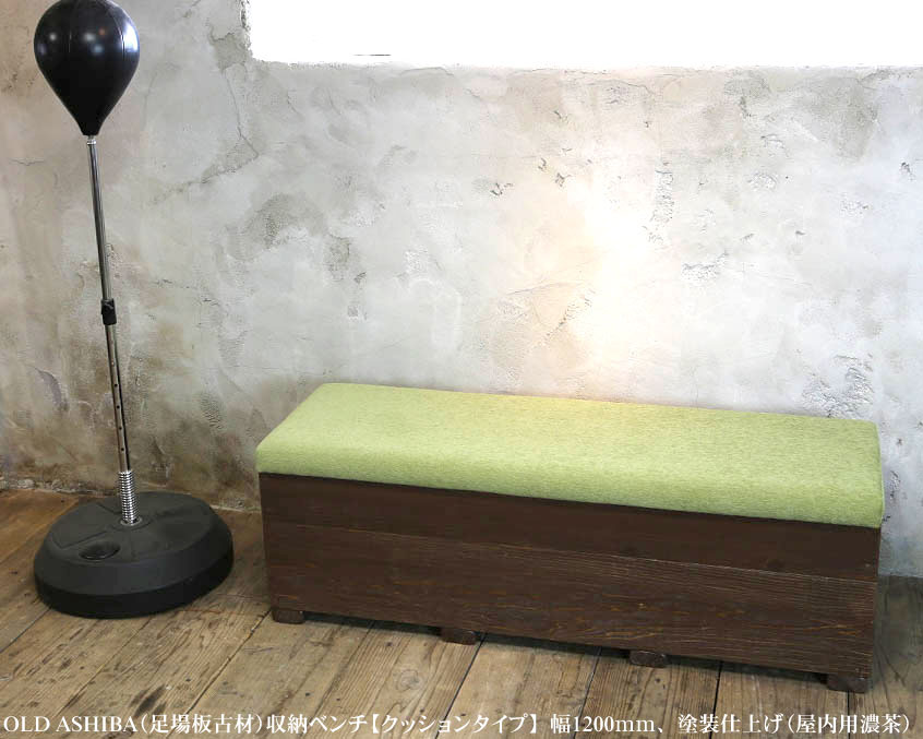 OLD ASHIBA(足場板古材)収納ベンチ 【クッションタイプ】幅1200mm×奥行400mm×高さ415mm 塗装仕上げボックススツール BOXスツール 収納スツール 収納ボックス オットマン BOX STOOL 【受注生産】 【特大商品】