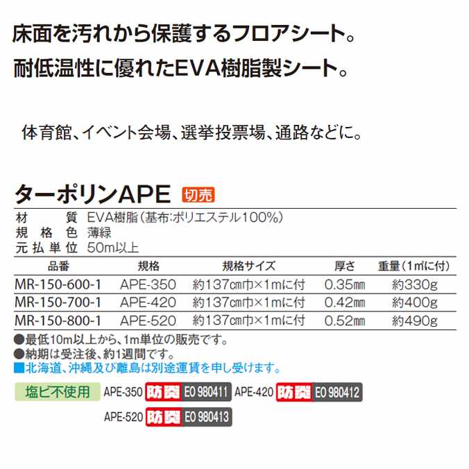 ・ターポリンAPE 商品ラインナップ ターポリンAPE 0.35mm ターポリンAPE 0.42mm ターポリンAPE 0.52mm 合計金額で送料無料の場合や送料無料の商品でも配送先が沖縄、北海道の場合は別途送料が必要になります。