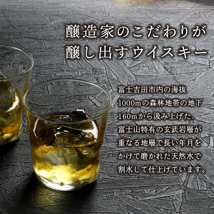 富士山の天然水を使用した醸造家のこだわりが醸し出すウイスキー ウイスキー『富士山』は富士吉田市内の海抜1000mの森林地帯、その地下160mから汲み上げた富士山特有の玄武岩層が重なる地層で長い年月をかけて磨かれた天然水で割水して仕上げています。